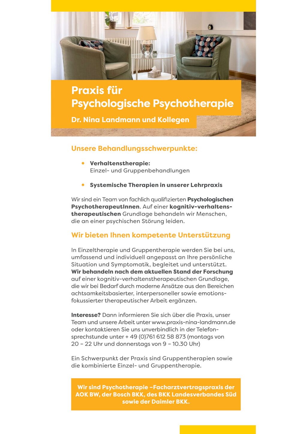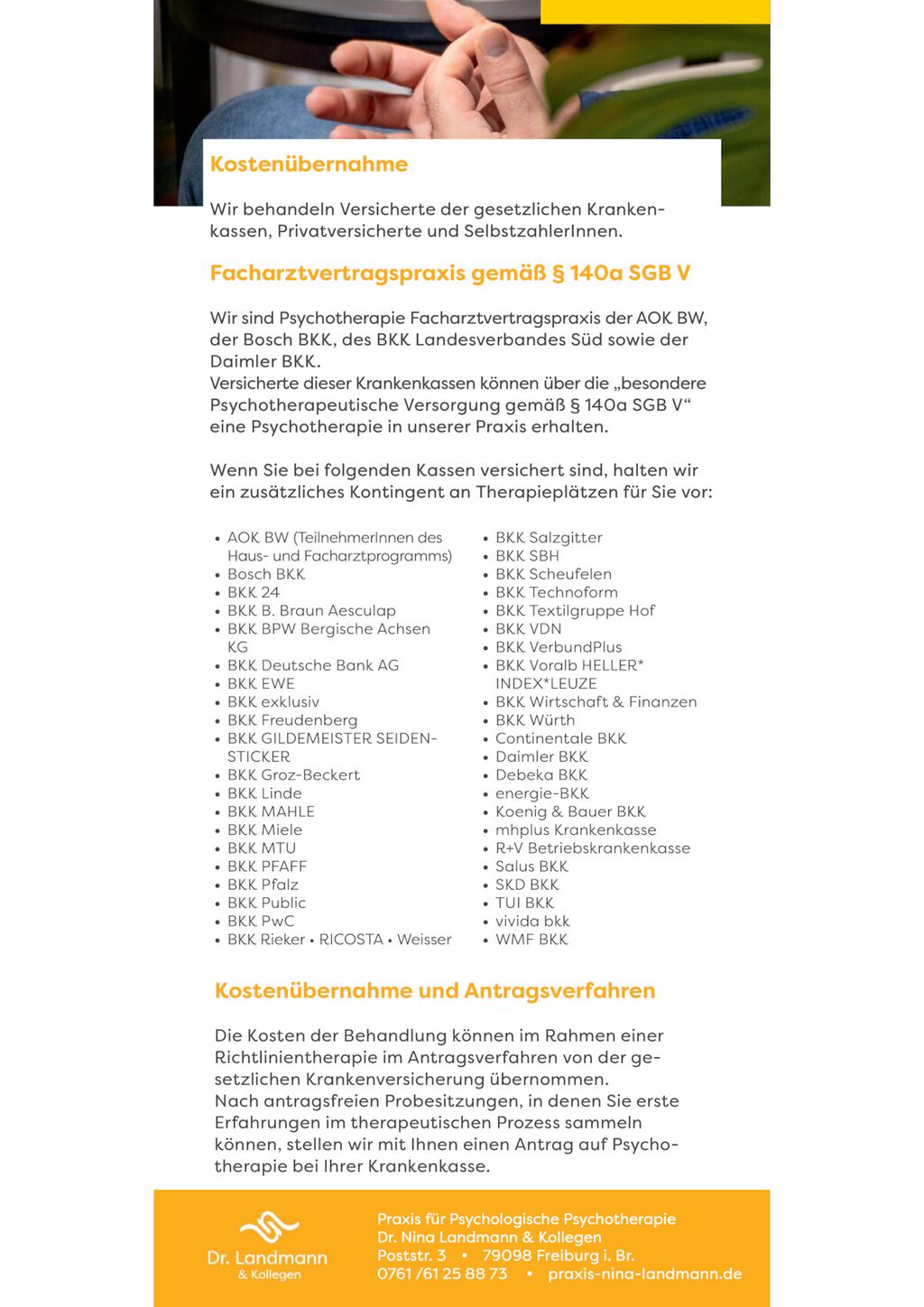 Depressionen, Burnout, Angststörungen, Krisensituationen – es gibt viele Gründe, eine Facharztpraxis für Psychotherapie aufzusuchen. Wir sind ein Team aus psychologischen PsychotherapeutInnen, die Behandlungen in Gruppen- und Einzeltherapie sowie Kombinationsbehandlungen anbieten. Unsere Praxis in Freiburg hat einen AOK BW Facharztvertrag für Psychotherapie, außerdem sind wir Facharztvertragspraxis des BKK Landesverbands Süd (Facharztvertrag BKK VAG) und der Daimler BKK (Facharztvertrag BKK GWQ).