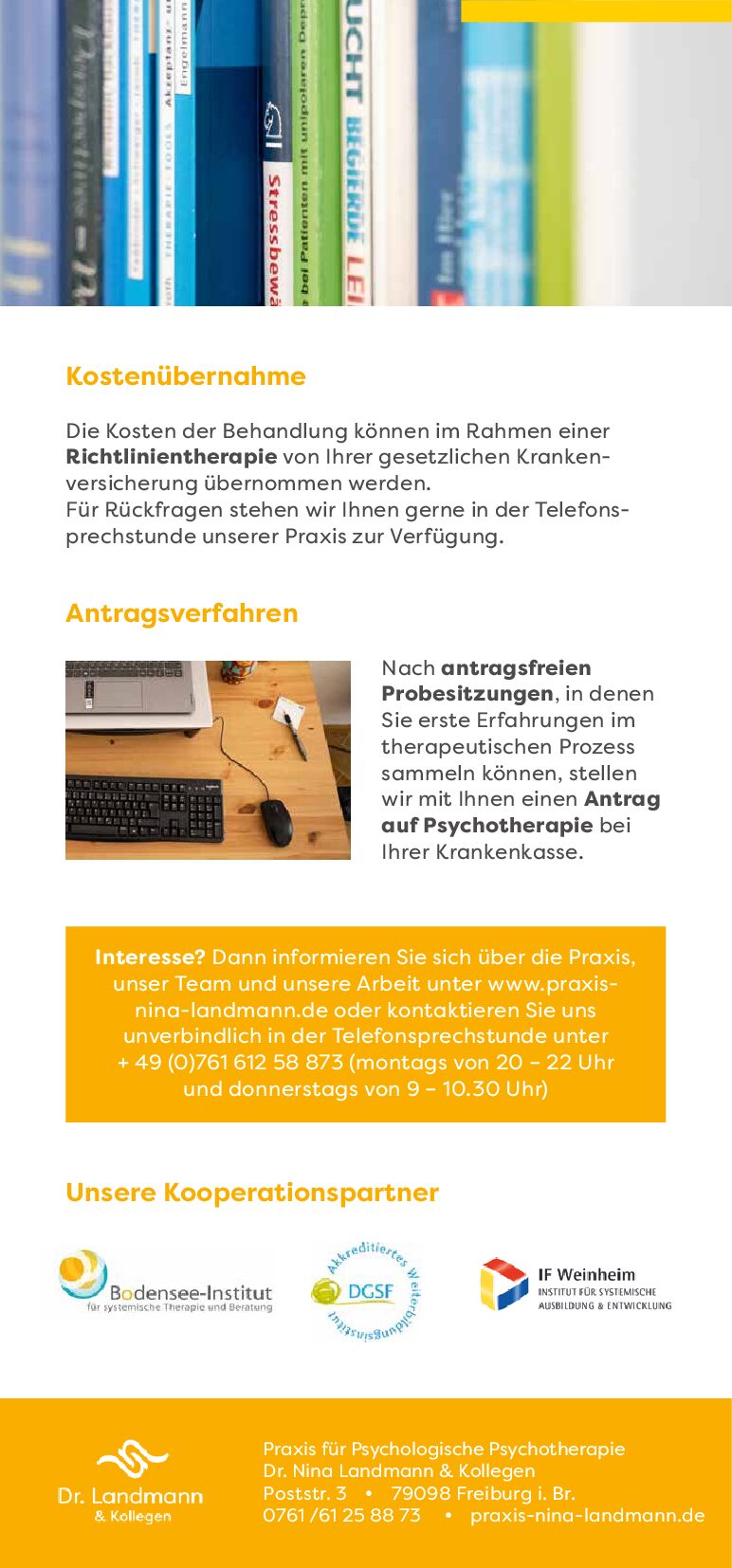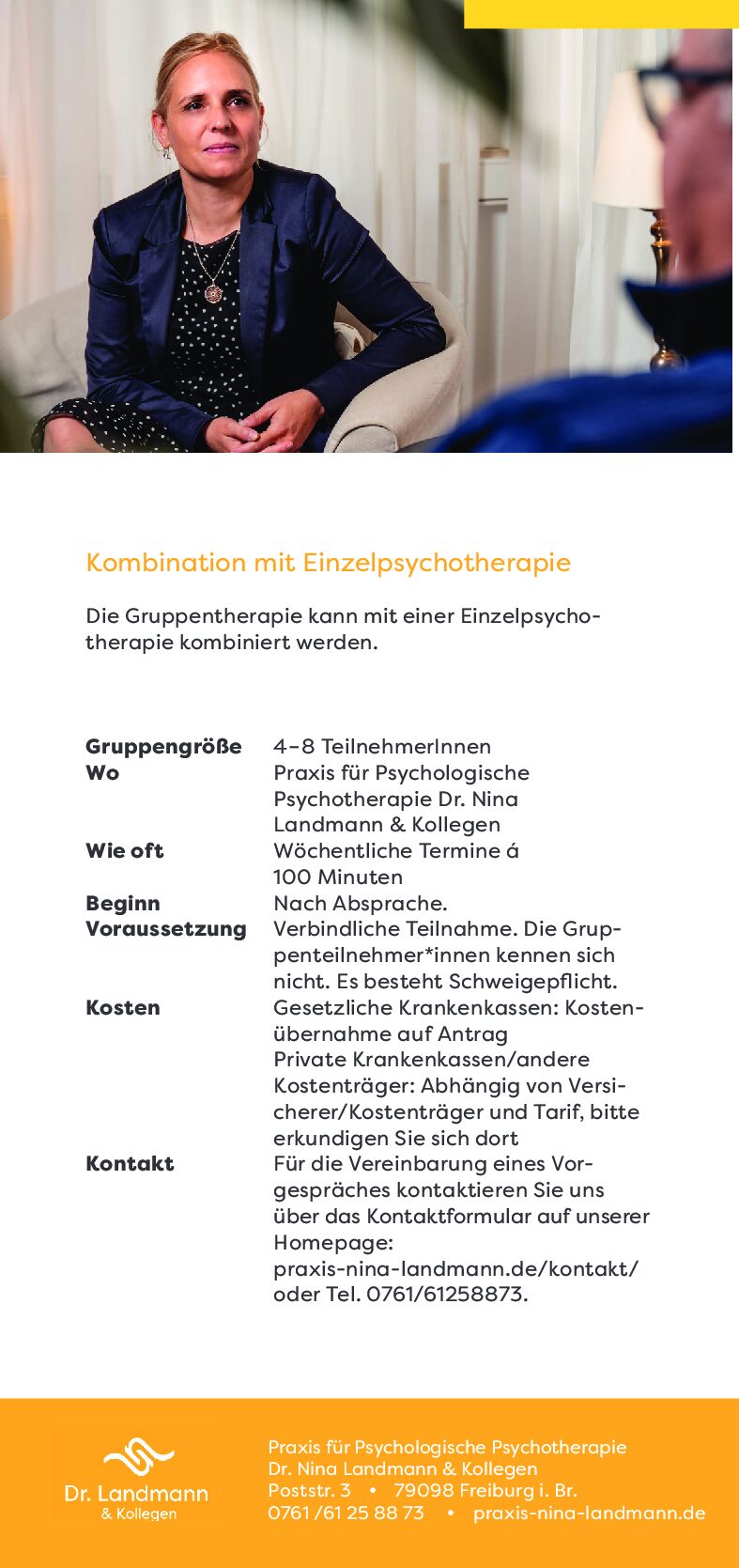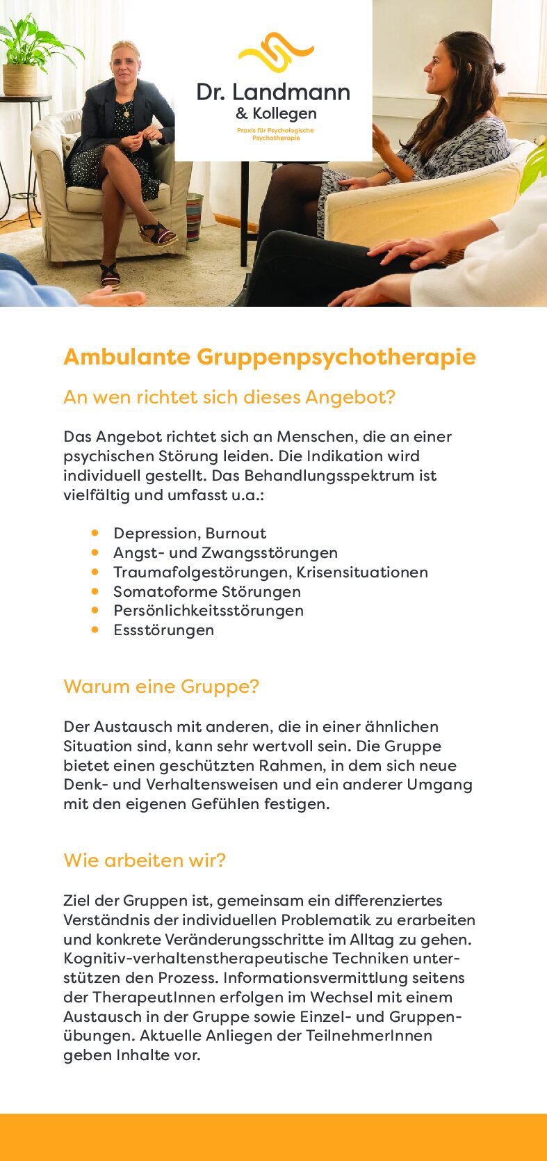 Wir bieten in unserer Praxis Gruppentherapie u.a. zur Bewältigung von Stress, Depressionen und Ängsten sowie zur Stärkung des Selbstwerts und zur Verbesserung der Emotionsregulationsfähigkeit an. Weitere Informationen hierzu finden Sie in unserem Flyer.