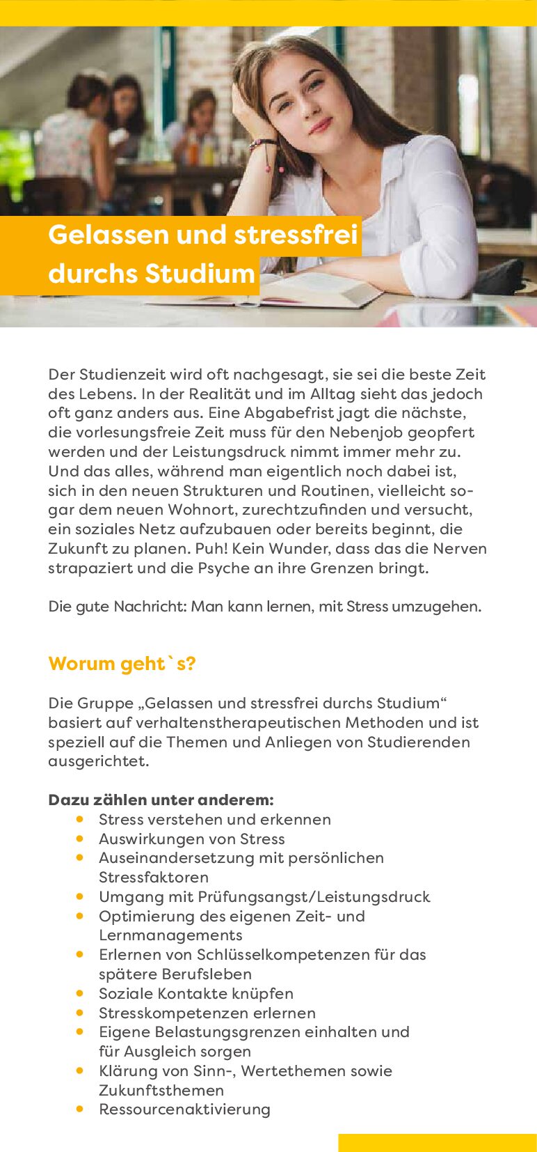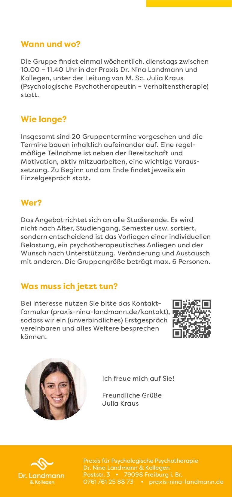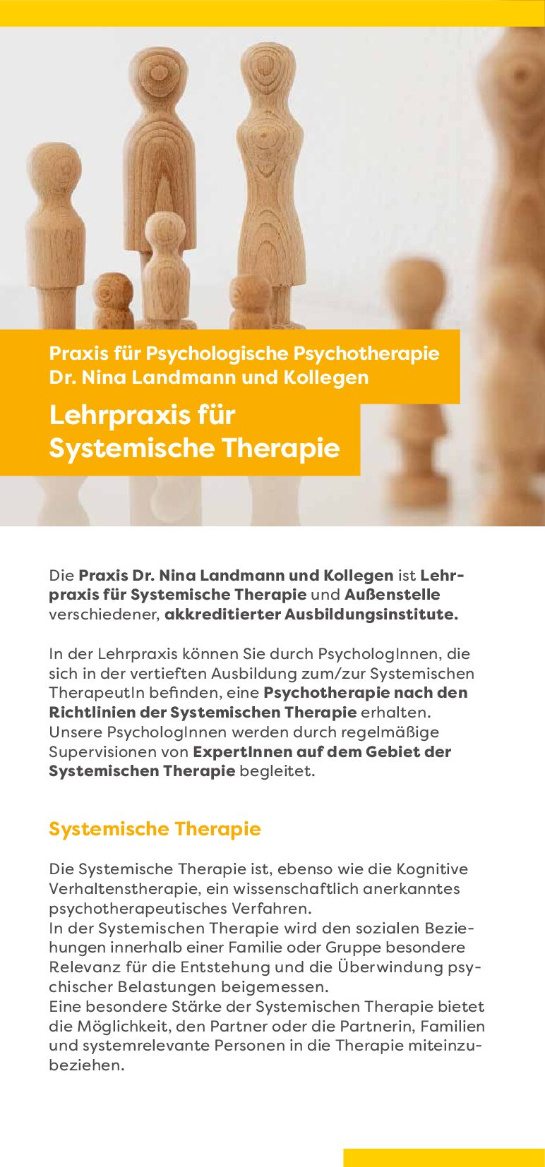 Wir bieten in unserer Praxis Gruppentherapie u.a. zur Bewältigung von Stress, Depressionen und Ängsten sowie zur Stärkung des Selbstwerts und zur Verbesserung der Emotionsregulationsfähigkeit an. Weitere Informationen hierzu finden Sie in unserem Flyer.